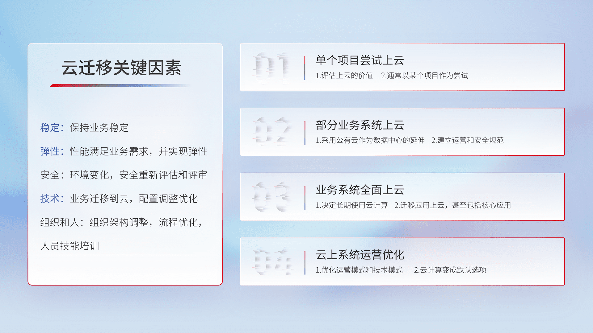 结合实际业务,,从规划设计、、、云平台选型、、云原生改造、、数据迁移、、、集成交付,,,迁移全过程为客户识别最佳上云路径,,做好风险识别管理,,,,设计网络架构、、身份权限、、、安全审计合规、、、操作审计、、日志审计、、监控告警策略、、、、多站点容灾设计等,,,对云上基础设施进行整体规划,,提升IT治理水平,,,以满足弹性、、、、高可用、、、高性能的需求。。