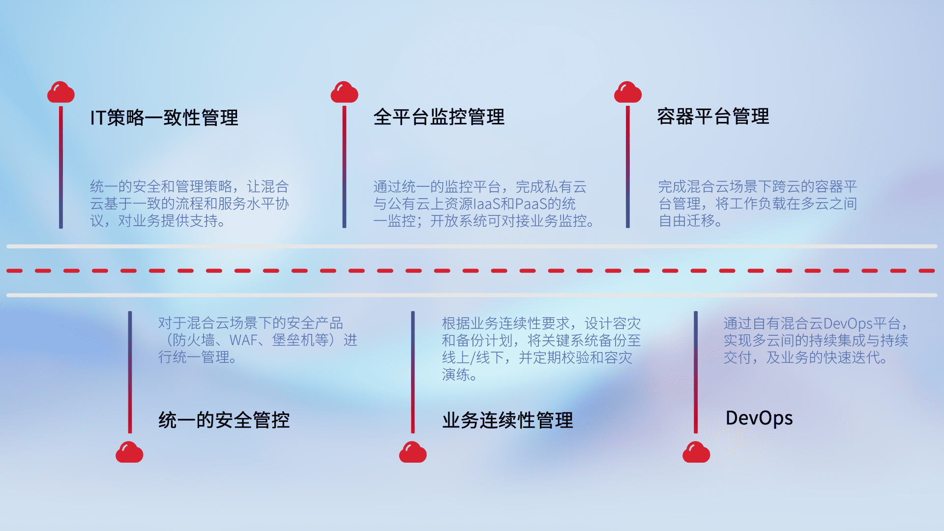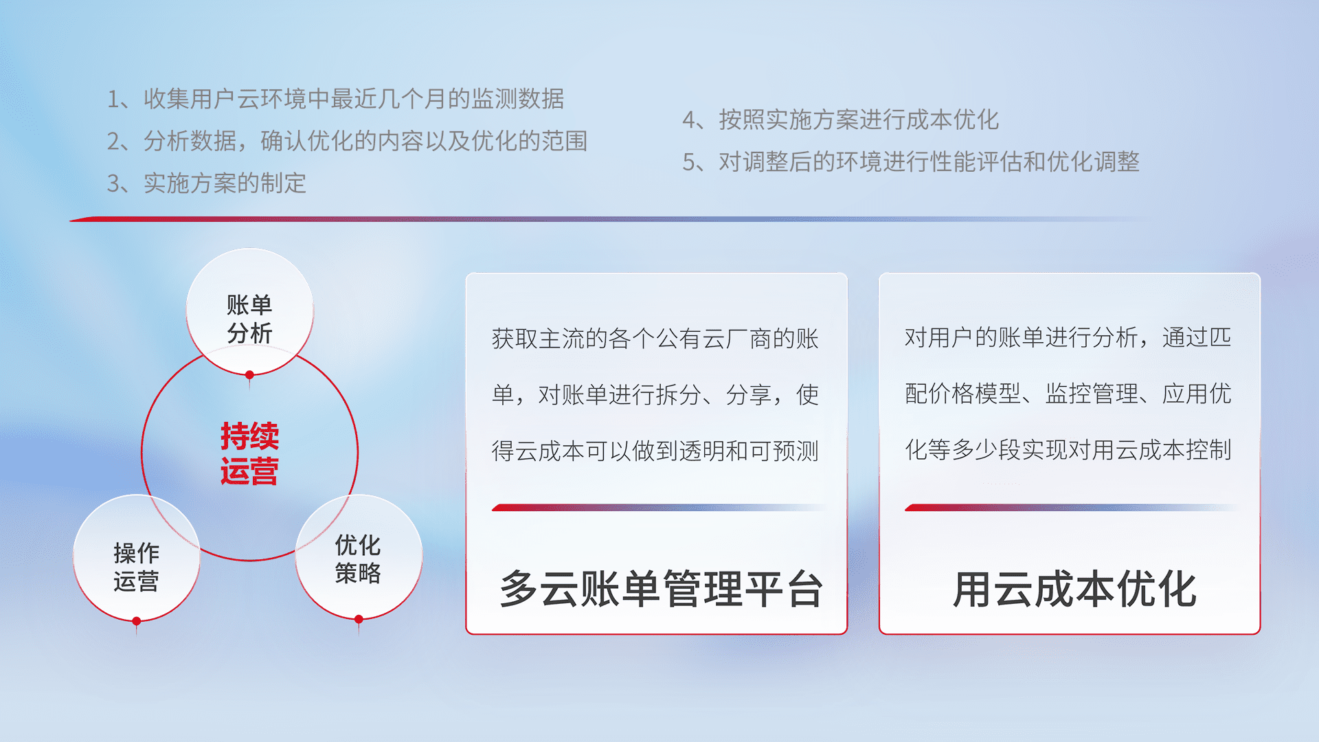 通过多云纳管,,,,以统一的资源数据模型把客户的云资源进行抽象和封装,,,,进而实现对多云资源的统一操作,,,保障云资源管理的可靠性、、稳定性与可用性。。。量身定制化运维内容,,,,配置、、、、开发运维、、、补丁管理、、备份、、、、监控、、、、认证和访问管理、、、、审计和日常巡检等,,,保障在用云过程中的可靠度,,,稳定度以及高可用率。。。